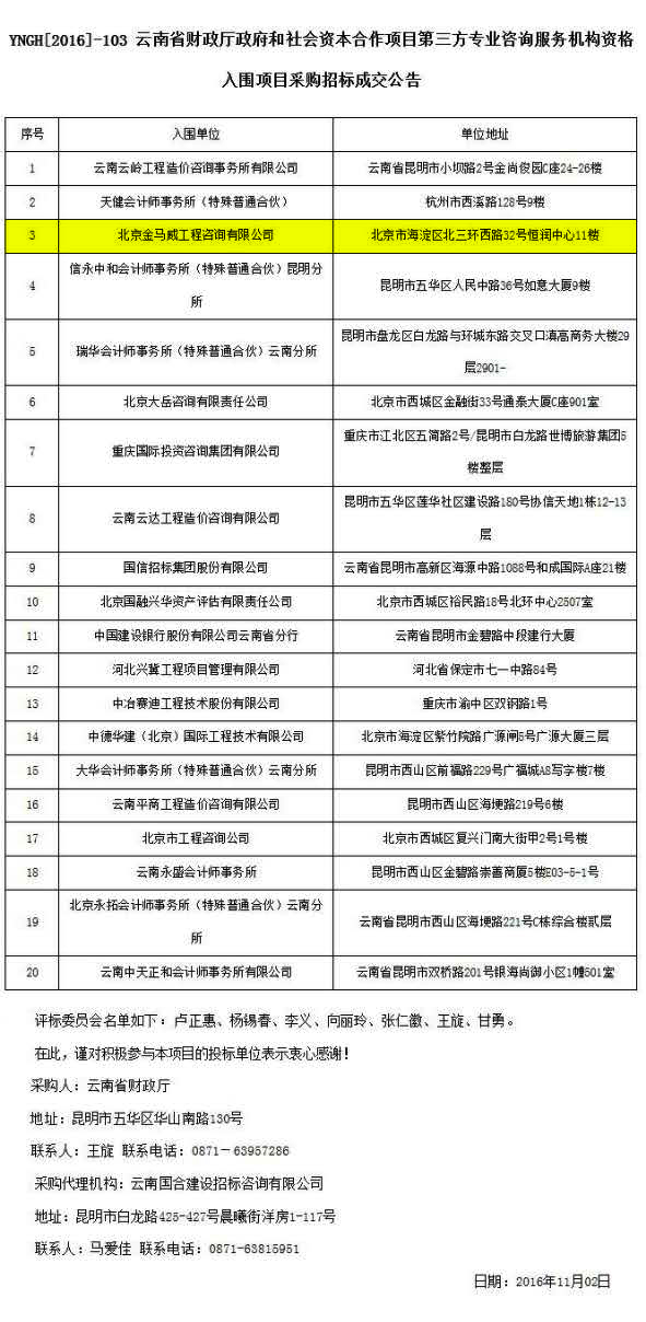 受云南省財(cái)政廳委托,云南國合建設(shè)招標(biāo)咨詢有限公司與2016年11月01日在云南省公共資源交易中心組織完成了云南省財(cái)政廳政府和社會(huì)資本合作項(xiàng)目第三方專業(yè)咨詢服務(wù)機(jī)構(gòu)資格入圍項(xiàng)目采購招標(biāo)評(píng)標(biāo)工作,根據(jù)評(píng)標(biāo)委員會(huì)評(píng)審結(jié)果,北京金馬威工程咨詢有限公司入圍項(xiàng)目。