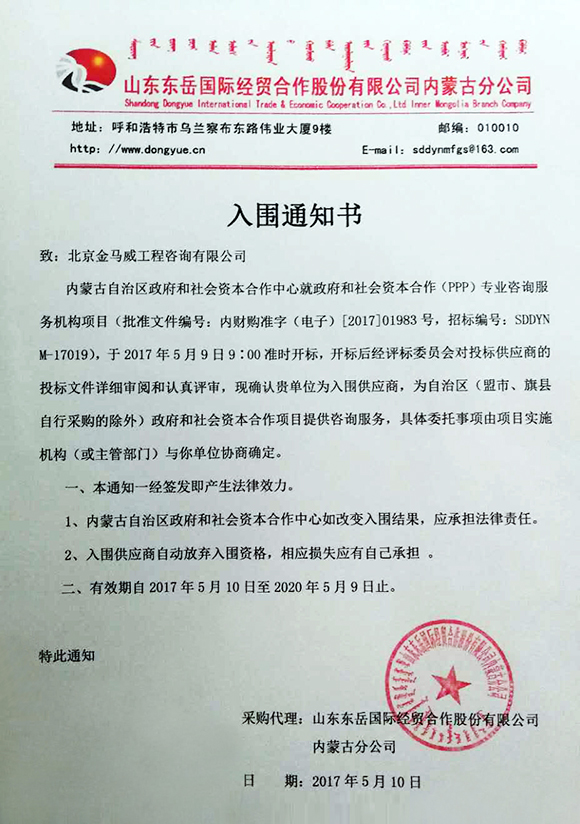 2017年5月10日,內(nèi)蒙古自治區(qū)政府和社會(huì)資本合作中心就政府和社會(huì)資本合作(PPP)專業(yè)咨詢服務(wù)機(jī)構(gòu)項(xiàng)目,開標(biāo)后經(jīng)評(píng)標(biāo)委員會(huì)對(duì)投標(biāo)供應(yīng)商的投標(biāo)文件詳細(xì)審閱和認(rèn)真評(píng)審,確認(rèn)我公司入圍“內(nèi)蒙古自治區(qū)政府和社會(huì)資本合作專業(yè)咨詢服務(wù)機(jī)構(gòu)項(xiàng)目”(招標(biāo)編號(hào):SDDYNM-17019)。